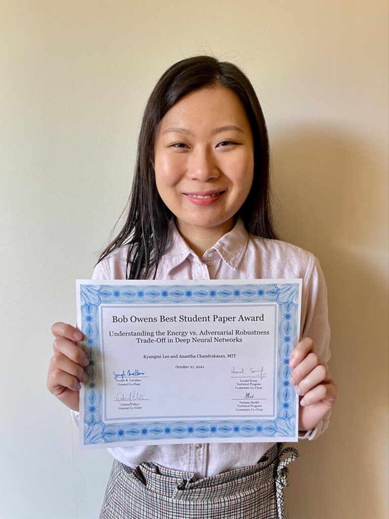 Kyungmi Lee, Anantha P. Chandrakasan, the Bob Owen's Best Student Paper Award, 2021 IEEE Workshop on Signal Processing Systems (SiPS), "Understanding the Energy vs. Adversarial Robustness Trade-Off in Deep Neural Network", 2021.